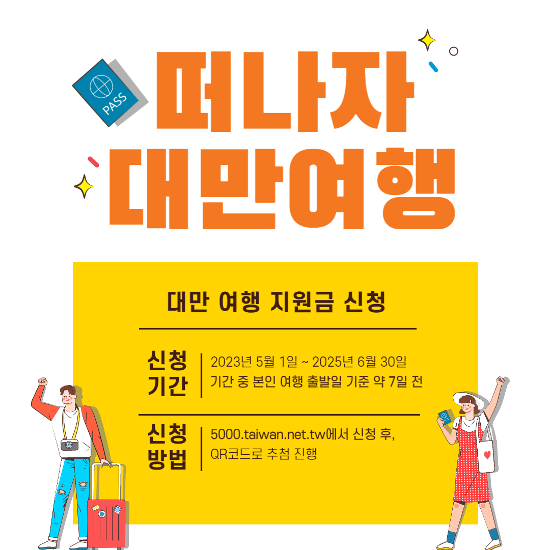 신청자격 대만 교통부 관광국은 국제 관광객들의 유치를 가속화하기 위해 해외 자유 여행객들을 대상으로 대만 여행 지원금 추첨 행사를 진행합니다. 2023년 25만 명, 2024년 15만 명, 2025년 10만 명을 지원할 예정이라니, 대만 여행을 염두에 두고 있었던 분들 전부 주목하시면 됩니다. 이 글을 보시는 모든 분, 다 신청 가능합니다. 지금 당장 신청하러 가볼까요? 대만 여행 지원금 신청 바로가기 신청대상 1 대만(중화민국) 외 국가의 여권 소지자 2 대만에 입국하여 3일 이상(90일까지 체류) 체류하며 여행사를 통해 진행되는 전 일정 단체 여행에 참가하지 않은 자 3 본국의 기타 다른 단체 보조금을 신청하지 않은 여행 업체 여행사를 통하지 않은 대만 외 국가의 여권 소지자는 모두 신청이 가능합니다..