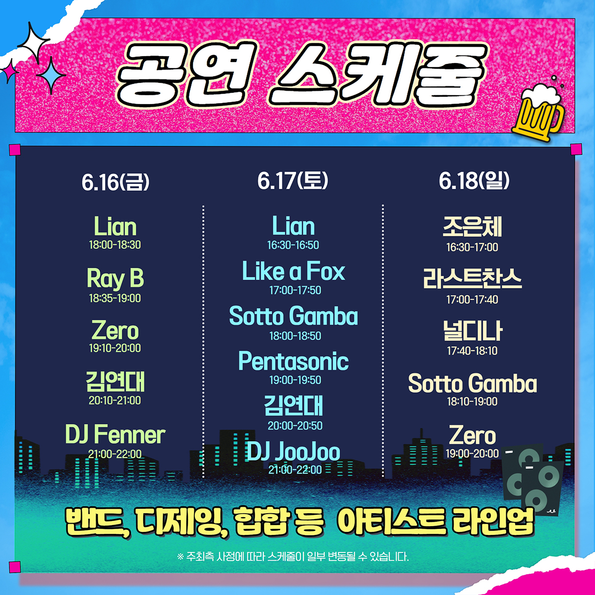 무더운 여름밤을 시원하게 만들어줄 아티스트 라인업입니다. 공연은 축제 기간 3일 내내 계속될 예정이니 원하는 아티스트 공연 시간에 맞춰 방문하시는 것도 좋을 듯 싶습니다.