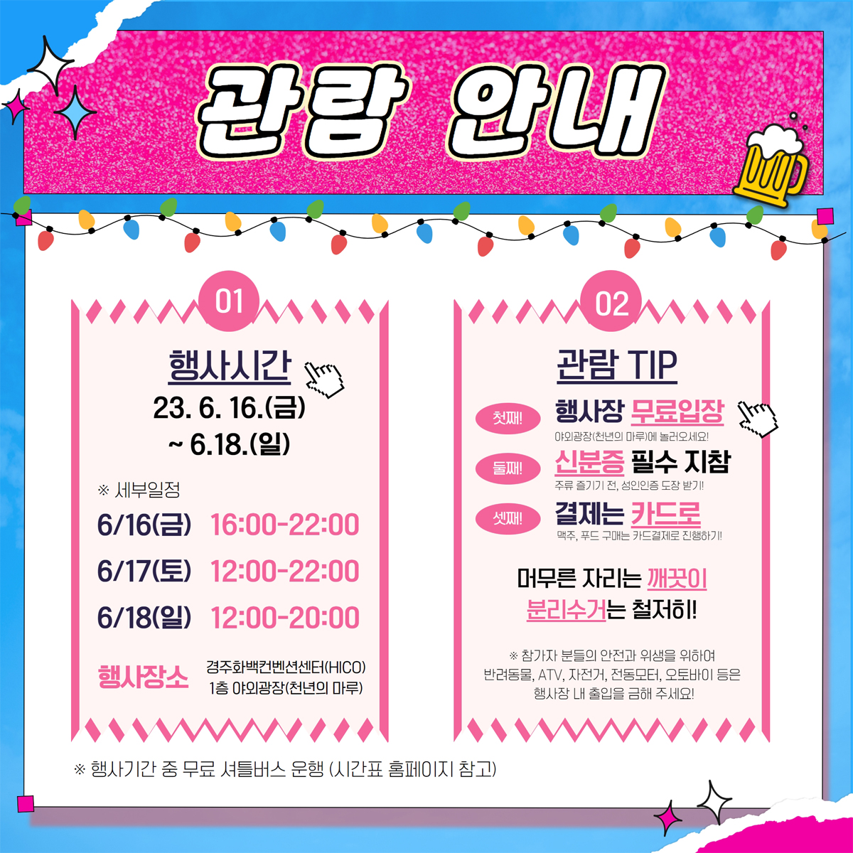 행사장 입장료는 별도로 없으나 미성년자는 출입 제한되기 때문에 반드시 신분증을 챙기셔야 합니다. 행사장 내 맥주 및 음식 구매는 전부 카드로만 가능하니 참고 바랍니다. 축제를 즐기고 나오실 때는 자리를 깨끗하게 정리해주시고 분리수거까지 완벽하게 하시고 나오시길 바랍니다. 또한, 안전하고 위생적인 축제를 위하여 반려동물, ATV, 자전거, 전동모터, 오토바이 등은 행사장 내 출입을 금지하니 유의하시기 바랍니다.