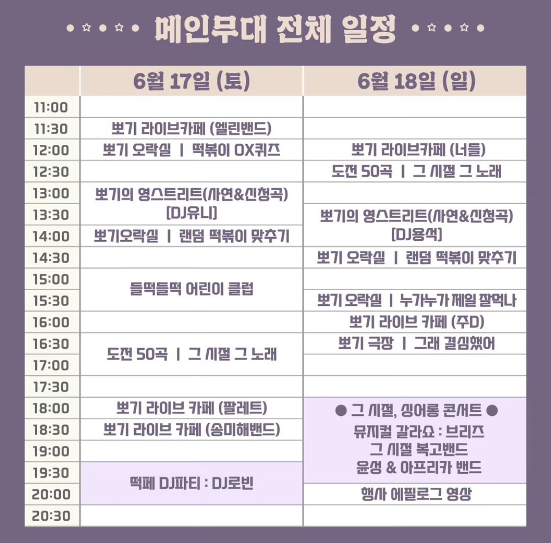 메인무대 및 미니스테이지 전체 일정을 참고하셔서 시간 맞춰 체험존에 방문하시면 너무 즐거운 시간이 될 듯 싶습니다. 즐거운 주말 되시길 바랍니다. 더위 조심하세요!