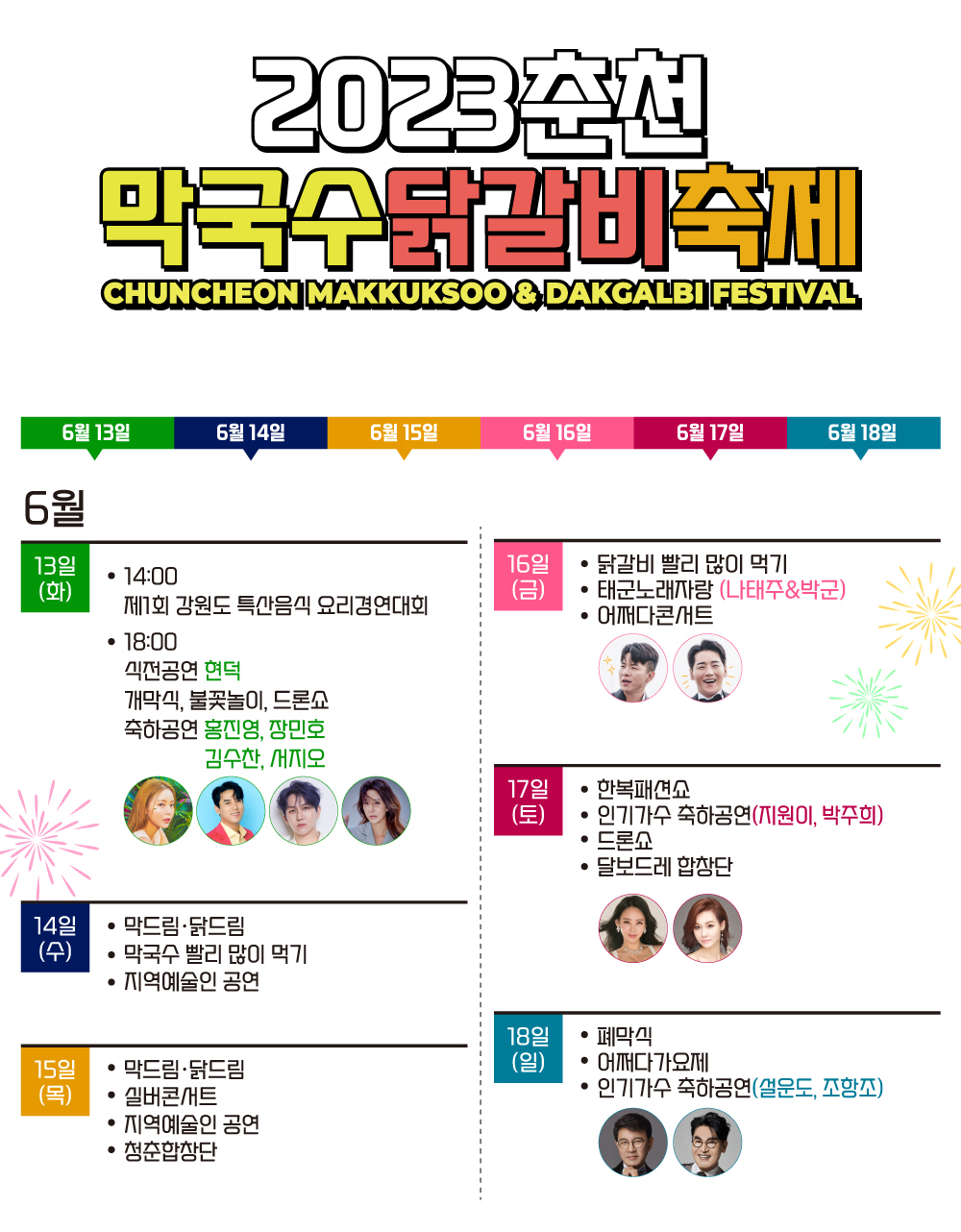 | 6. 13.(화) | 제1회 강원도 특산음식 요리경연대회 | 강원도의 요리장인들이 참여하는 요리 경연 / 오후 2시 |
