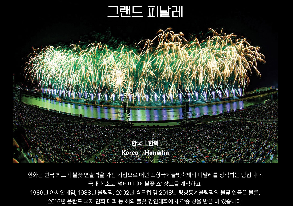 - 스웨덴의 예테보리스, 이탈리아의 파렌떼, 필리핀의 드래곤, 한국의 한화에서 불꽃 연출력을 뽐내게 됩니다.