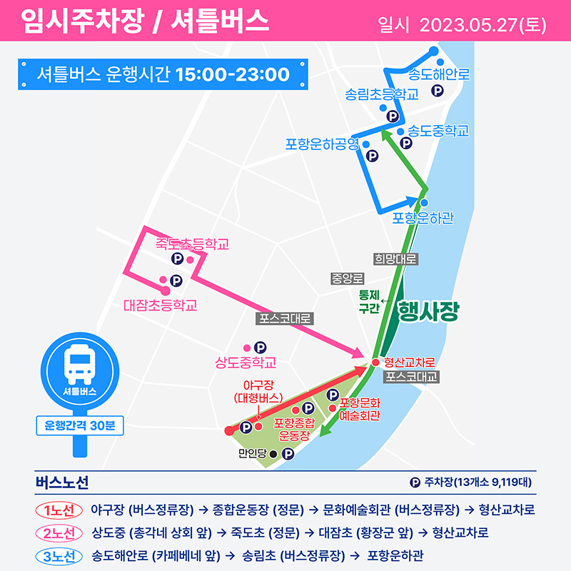 포항시에서는 축제기간동안 교통 통제구간 및 임시주차장 13개소, 셔틀버스 3노선을 운영한다고 합니다. 가능한 임시주차장을 이용한 후, 셔틀버스를 통해 행사장으로 입장하시기를 바라며 교통난 없이 즐거운 시간이 되시기를 바랍니다.